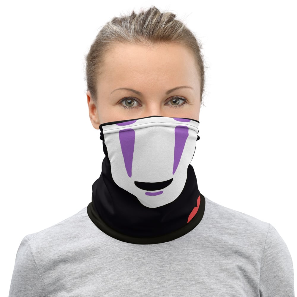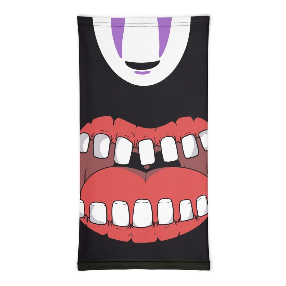 Iconic Studio Ghibli character. Let this lonely spirit follow you around! This No Face gaiter with hungry mouth bottom is a versatile accessory that can be used as a face covering, headband, bandana, wristband, or neck warmer.
